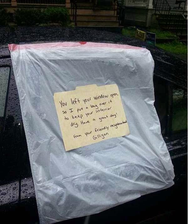 3) Un hombre se encontró con un coche cuyo cristal estaba roto. Estaba lloviendo y se tomó su tiempo en taparlo para que no entrara lluvia en su interior.