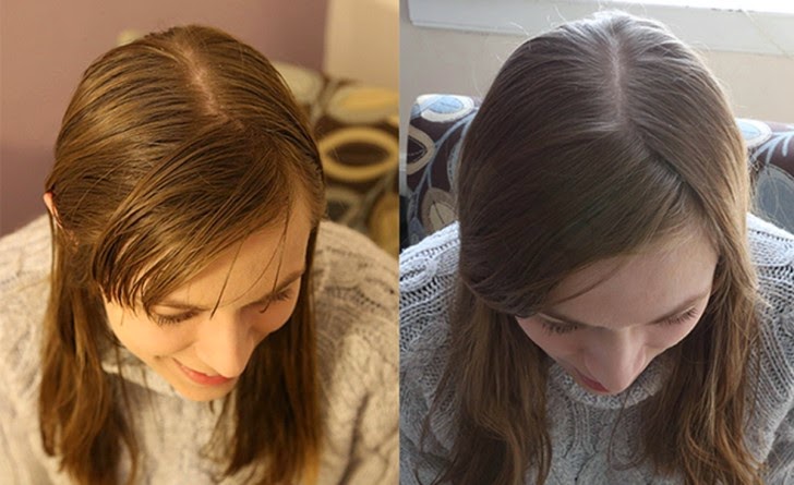 Este es el pelo de Margaret tras 20 días sin lavarlo (a la izquierda de la imagen) y después de lavarlo con bicarbonato y vinagre de manzana (a la derecha de la imagen).